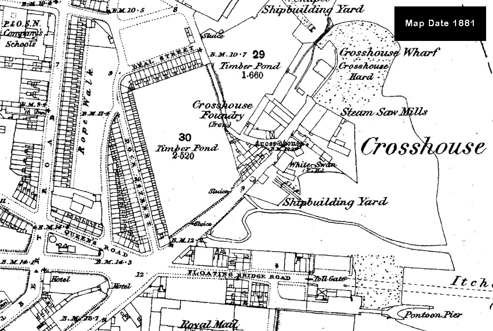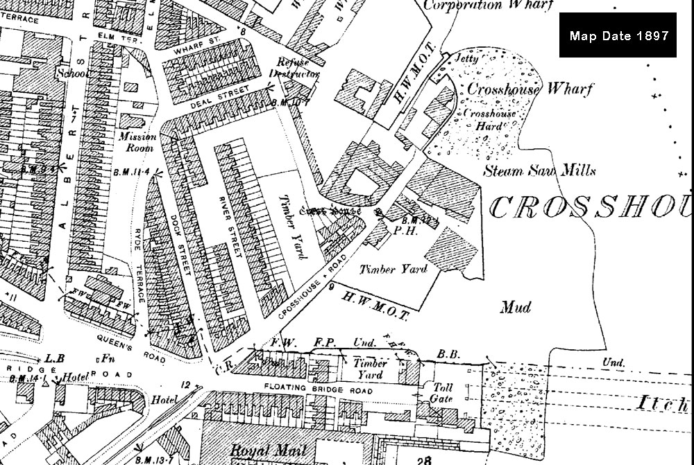 | The Timber Pond has been filled in and River Street built plus a few new houses in what is now called Crosshouse Street. More houses have also been built in Floating Bridge Road. Wharfe Street has appeared above Deal Street. (H.W.M.O.T = High Water Mark of Ordinary Tides ) |